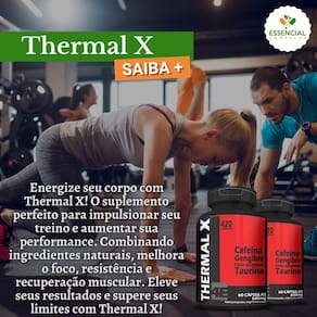 Compre 2 Leve 3 Thermal X 500mg 60 Cápsulas Bem-vindo à Essencial Cápsulas, sua fonte de suplementos naturais de alta qualidade Apresentamos o Suplemento Thermal X, uma fórmula exclusiva produzida pela renomada marca 4Elementos. Cada frasco contém 60 cápsulas. O Thermal X é um suplemento desenvolvido para proporcionar energia e foco para o seu dia a dia. Sua fórmula contém ingredientes cuidadosamente selecionados para auxiliar no desempenho físico e mental. Benefícios do Suplemento Thermal X: - Estímulo ao metabolismo: A presença de cafeína e citrus aurantium extrato de laranja amarga pode contribuir para o aumento do metabolismo, favorecendo a e a corporal. - Aumento da energia: A combinação de cafeína e taurina pode auxiliar na melhora da disposição e da energia, aumentando a resistência física e mental. - Melhora do foco e concentração: O gengibre é conhecido por suas propriedades que podem auxiliar na melhora do foco e concentração. Recomendação de Uso: Tomar 1 cápsula duas vezes ao dia, ou conforme indicação do médico ou nutricionista. Composição: Cada cápsula contém Cafeína 200mg , Citrus aurantium extrato de laranja amarga 200mg , Taurina 150mg e Gengibre 50mg . Contraindicações: - Pessoas com problemas cardíacos, pressão alta, diabéticos e com problemas de insônia devem evitar o consumo deste produto. - Consultar médico ou nutricionista antes do consumo, especialmente para gestantes, lactantes, idosos e portadores de enfermidades. Este produto não substitui uma alimentação equilibrada e seu consumo deve ser orientado por um profissional de saúde. Garantimos a qualidade e a confiança em nossos produtos. Trabalhamos apenas com fabricantes que seguem rigorosamente as diretrizes da Anvisa. Os resultados positivos obtidos pelos nossos clientes são o motivo pelo qual eles sempre retornam à nossa marca. produto isento de registro conforme RDC Anvisa 27 de agosto de 2010 Envios: Dúvidas Fique à vontade para entrar em contato conosco. Estamos aqui para ajudar Marca: Não Informado