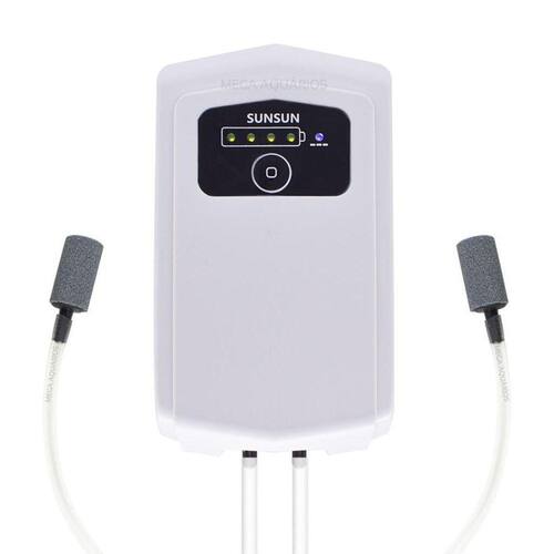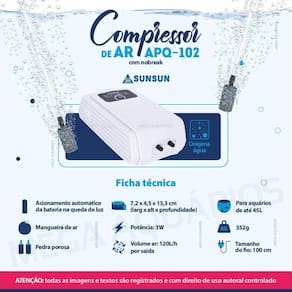 Compressor de ar Sunsun APQ-102 com nobreack a bateria liga automaticamente quando ocorrer quedas de energia - bivolt - acompanha mangueira e pedra porosa