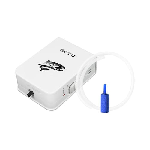 Compressor de ar Boyu 1 saída com bateria recarregável ideal para transporte de isca viva e manter a oxigenação do aquário em caso de queda de luz - acompanha mangueira e pedra porosa