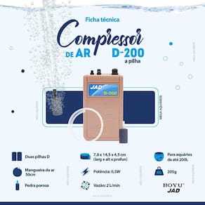Compressor bombinha de ar oxigenador jad / boyu d-200 para quedas de energia aquário, transporte de isca viva, peixes, pesca, pescaria + pedra porosa e mangueira de arO compressor de ar a pilha jad boyu d-200 é uma solução simples para manter os níveis de oxigênio em seu aquário ou lago quando ocorrer quedas de energia. É um equipamento portátil e fácil de usar, ideal para transporte de isca viva e peixes.Características:Botão liga/desligaClip para prender no vidro do aquário ou em bolsa de transporte de iscasUma saída de arAuxilia na oxigenação da água Não estressa os peixesFácil manuseioPortátilLeveSeguroItem indispensável para aquaristasRealiza a troca de gases tóxicos presente na água por meio do fluxo de águaEspecificações técnicas:Fabricante: boyu / jad Modelo: d-200Uma saída de arFluxo: 2.0 l/min - 120 l/hPressure: 0.010 mpaPotência: 0,5wTamanho: 7,8 x 14,5 x 4,5 cm (larg x alt x profundidade)Peso: 205gIndicado para aquários de até: 200lAlimentação: 2 pilhas tamanho dNota:A marca será enviada conforme disponibilidade.As marcas jad e boyu pertencem ao mesmo fabricante, os produtos são exatamente iguais e chegam ao país por empresas diferentes, cada uma com um direito de uso de marca. Aplicação:Manter a oxigenação de aquário quando faltar energiaTransporte de iscas vivas e peixes Itens inclusos:1 - compressor de ar d-2001 - 50cm mangueira de ar de silicone de 4mm 1 - pedra porosa de 2,5 x 1 cmImagens e textos registrados. Todos os direitos reservados a essa loja e as lojas parceiras devidamente autorizadas.