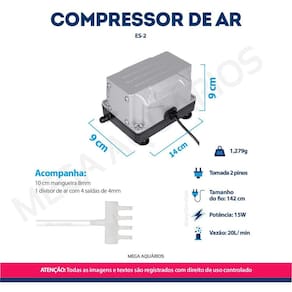 Compressor de ar oxigenador / aerador Boyu ES-2 20L/min para lago ou aplicação em indústria, acompanha divisor de ar de 4 saídas O compressor de ar Boyu ES é fabricado em alumínio injetado, que garante a pressão sem perdas, é um equipamento indispensável para manter os níveis de oxigênio em lagos, além de inúmeras aplicações no setor industrial. O que você precisa saber antes de comprar: Super potente Baixo consumo de energia Extremamente resistente Indicado para oxigenação de grande porte Não gera resíduos de óleo ou lubrificante no ar Ruído baixo/ médio quando comparados a compressores de mesma potência Fluxo intenso e constante de ar Alumínio intejado Pode ficar ligado 24h por dia Saída de ar principal para mangueira de 8mm Acompanha divisor de ar de 4 saídas com saída de ar para mangueira de 4mm Tomada padrão 2 pinos Pés emborrachados evita o deslocamento e diminui o ruído decorrente da vibração do motor Auxilia na oxigenação da água e realiza a troca de gases tóxicos presente na água por meio do movimento gerado pelas bolhas de ar Precisa ficar protegido de sol e chuva Não possui controle de vazão Não acompanha mangueira de silicone de 4mm e pedras porosas Compre nesse anúncio diretamente com um revendedor oficial Boyu no Brasil. Especificações técnicas: Marca: Boyu Modelo: ES-2 Voltagem: Escolha a voltagem no botão do anúncio Potência: 15W Vazão: 20L/ min Saídas de ar principal: 1 Divisor de ar com 4 saídas Pressão: 0.02 MPa Tamanho: 9 x 9 x 14cm larg x alt x profundidade Tamanho do fio: 142cm Peso: 1,279g Aplicação: Oxigenação de lagos e tanques de criação de peixes Oxigenação de baterias de aquários Enchimento de brinquedo infláveis Enchimento de colchão inflável Para Ferramenta de aplicação de pintura Bolhas de ar em paredes, balcões, tubos com água de festas eventos Hidroponia Máquina de gravação e corte de laser Cervejaria artesanal Envase de bebidas Indústria plástica, gráfica, têxtil, química, agrícola, alimentícia e psicultura. Conteúdo da embalagem: 1 compressor de ar 1 pedaço de mangueira de 8mm 1 divisor de ar com 4 saídas Dicas de segurança: 1- Mantenha o compressor de ar sempre acima do nível da água, assim, caso acabe a energia, anula o risco de a água retornar pela mangueira de ar e posteriormente causar um curto-circuito no aparelho. 2- Não estique o fio da tomada completamente, ligue o equipamento sempre deixando uma folga formando uma espécie de barriga no fio, assim, caso escorra água pelo fio, ela não entrará em contato com a água. 3- Deixe em local seco, protegido do sol e chuva. Recomendações para uma maior durabilidade do compressor: Efetuar a limpeza dos acessórios a cada 15 dias Obrigado pela visita e boas compras ATENÇÃO Nossas imagens e textos são registrados e com direito de uso reservado a essa loja e as lojas parceiras devidamente autorizadas. Marca: Não Informado