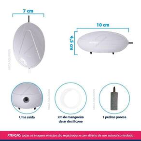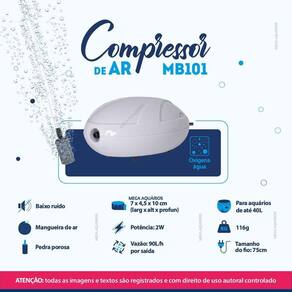 Especificações técnicas: Marca: Aquam Modelo: MB-101 Voltagem: 220V Potência: 2W Saídas de ar: 1 Fluxo: 90L/h Pressão: 16Kpa Tamanho: 7 x 4,5 x 10 cm larg x alt x profundidade Peso: 116g Indicado para aquários de até: 40L.
