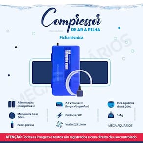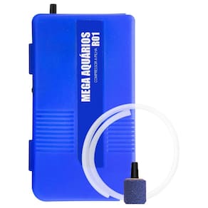 O compressor de ar a pilha Mega Aquários é uma solução simples para manter os níveis de oxigênio em seu aquário quando ocorrer quedas de energia. É um equipamento portátil e fácil de usar, é excelente para transporte de isca viva e peixes.
