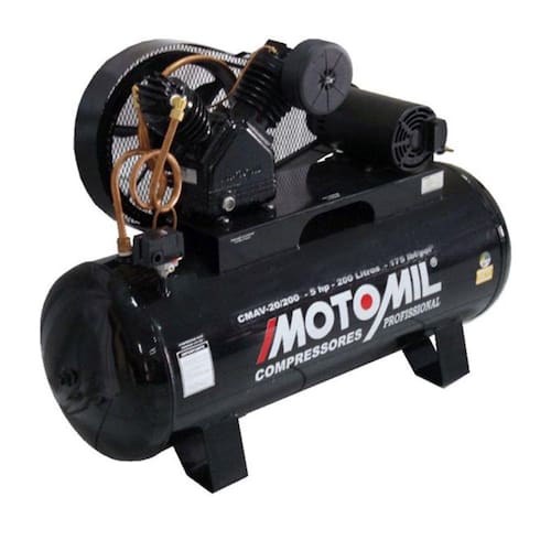- Deslocamento teórico: 20 pés³/min - 566L/min - Potência do motor: 5Hp - 3,73Kw - Óleo indicado: ISOVG100 ou AW150 (MOTOLUB) - Volume reservatório: 200 litros - Unidade compressora: 2 estágios - 2 pistões - Polos do motor: 2 - Pressão de operação: 175Lbf/pol² - RPM unidade compressora: 1030 RPM - Medida óleo cabeçote: 700 ml - Garantia: 12 meses - Peso: 169 Kg - Uso profissional