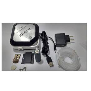 Acessórios: 1.5mt de mangueira silicone 4mm; 01un. Difusor de pedra porosa; 01 refil filtro de ar Kit de presilha e suporte; 01 Fonte bivolt; 01 cabo entrada em USB.