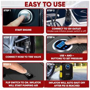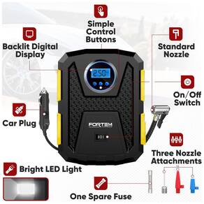 Portátil e Compacto Leve seu compressor de ar Fortem para carro com você e esteja pronto para qualquer emergência. Os cabos de alcance de 4m são zenados dentro da pequena unidade compacta, tornando os compressores de ar o acessório perfeito para automóveis. Multiuso Perfeito para pneus de carro, caminhão, suv, motocicleta. Inclui três bicos para bolas esportivas, colchão de ar, brinquedos de piscina e outros infláveis. Também pode ser como uma bomba de ar para bicicleta. Compatível com todos os veículos com tomada de isqueiro DC 12V. Recursos de segurança integrados A lanterna LED automática super brilhante torna a bomba de ar do carro adequada para emergências na estrada e uso noturno. O compressor de ar Fortem 12v está pronto sempre que você precisar encher um pneu furado. Fácil de usar ligue a ignição do carro, conecte o plugue do carro à tomada de energia DC 12 volts, defina o PSI desejado e aguarde o visor parar de piscar. Mude o interruptor para ligado, o inflador então bombeia ar e desliga automaticamente quando o PSI é atingido Marca: Não Informado