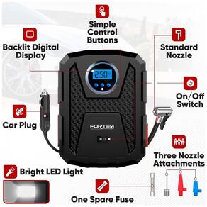 Recursos de segurança integrados A lanterna LED automática super brilhante torna a bomba de ar do carro adequada para emergências na estrada e uso noturno. O compressor de ar Fortem 12v está pronto sempre que você precisar encher um pneu furado.