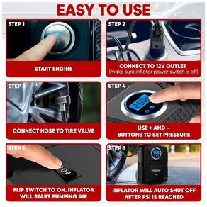 Fácil de usar ligue a ignição do carro, conecte o plugue do carro à tomada de energia DC 12 volts, defina o PSI desejado e aguarde o visor parar de piscar. Mude o interruptor para ligado, o inflador então bombeia ar e desliga automaticamente quando o PSI é atingido