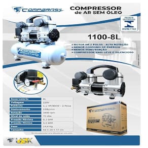 COMPRESSOR DE AR ODONTOLOGICO 120PSI 25L ISENTO DE ÓLEOIndicado para trabalhos diversos como serviços de manutenção, ateliês de artesanato, em pequenas oficinas, para uso doméstico e lazer. Ideal também para consultórios de dentista e clínicas médicas, que precisam de um equipamento seguro, limpo e eficiente.Acompanha um manômetro em sua saída para verificar a pressão interna do reservatório.Motor mais forte e potente, menor gasto de energia elétrica, produzindo menos calor e garantindo mais vida útil para o compressor.VantagensMotor 02 Polos - Alta RotaçãoMenor Consumo de EnergiaMenor ManutençãoMais Leve e SilenciosoIsento de ÓleoEspecificaçõesMarca: U.S.KModelo: 1100-25LDesligamento: AutomáticoPotência: 1.1 HP (800W);Ruído: 70dB(A) 1M;RPM: 3400;Volume reservatório: 25L;Pressão máxima: 102 libras (7 Bar);Ajustável: 120 libras (8 Bar);Auto desligamento: Religa em 58 libras;Fluxo de ar teórico: 150L/min 5.3pcm;Acessórios Inclusos02 - Filtros para redução de Ruído e Ar04 - Sistema de estacionamentoPrincipais Atenções para usoNão utilizar em temperaturas ambientes abaixo de -5ºC ou acima de 40ºC;Só movimente o compressor pela alça de transporte;Deixe encher até 80Psi antes de usar;Não remova a Válvual de Segurança;Não altere o interruptor de pressão automático;Não obstrua o sistema de sucção/captação de Ar (Filtros e Motor);Verificar a Vávula de Segurança antes de toda operação;Drenagem diária do Ar condensado (para evitar corrosão e outros problemas severos);Ligue adequadamente em uma linha de tensão suficiente;