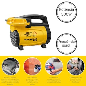 COMPRESSOR DE AR DIRETO PORTATIL CS-5,3 JET MASTER 500W + KIT PINTURA SCHULZDesenvolvido e fabricado pela Schulz no Brasil com materiais e processos de última geração, o novo Jet Master torna o seu hobby ainda mais profissional. Excelente para pintar, pulverizar, limpar, inflar objetos e calibrar pneus, reúne inovação, tecnologia e benefícios únicos. Leve, compacto e fácil de transportar, com exclusivo monobloco injetado em alumínio, o motocompressor tem alça ergonômica e funcional com patente requerida que cobre as partes quentes do equipamento e conduz o ar de refrigeração até a tampa. Os pés de borracha patenteados aumentam a aderência e estabilidade do produto, além de minimizar sua vibração. O motor Schulz com protetor térmico entrega maior durabilidade e confiabilidade. Por ser isento de óleo, o produto não requer manutenção. Ou seja: o Jet Master está sempre pronto para uso. Com o kit mais completo do mercado, a nova geração do Jet Master oferece a confiança em adquirir um produto de alta qualidade, produzido pela maior fabricante de compressores da América Latina, e ainda conta com a maior rede de assistência técnica do Brasil.Especificações:Modelo Jet Master G5Código 127 V 920.1297-0 / 220 V 920.1298-0Deslocamento Teórico pcm 5,3Vazão na Pressão 30 lbf/pol² 2,3 pcm / 65 l/minPressão Máxima lbf/pol² 50 / bar 3,5Motor Elétrico Schulz Monofásico com Protetor Térmico 0,50 kW / 500W Peso do Compressor + Acessórios 8,4 kg4P 60HZ Motor Elétrico Monofásico 500 WPeso Líquido 8,4 kgDimensões C x A x L 370 x 250 x 170 mmConteudo da embalagem: 01 MOTOCOMPRESSORVálvula reguladora de pressão/segurançaSaída de ar com rosca 1/4 BSP para acoplar a mangueiraPlaca de válvulasAlça para transporteInterruptor liga/desligaTampa traseiraCabo de ligação com pluguePéMotor Elétrico e carcaça do motorTampa do cárterAcompanha Kit de acessórios:Calibrador de pressão (4 a 50 psi)Bico de encher pneu tipo ar diretoMangueiraAnel de vedação da mangueiraPistola de pintura ar diretoPorca GiratóriaBico de limpezaBico para encher bolaPistola multiuso sem bicoBico/capa leque (Kit R/L)Garantia de 12 meses contra defeitos de fabricação.*Não nos responsabilizamos pela instalação deste produto.*Objetos de decoração das fotos nao estão inclusos.