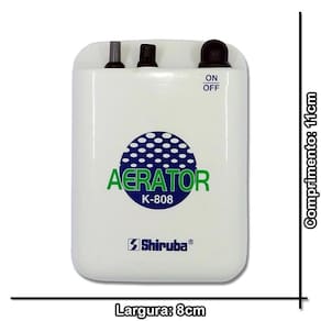 Compressor de Ar Pesca Oxigenador Shiruba K-808 à Pilha Produto para quem pesca com isca viva mantendo as iscas vivas por muito mais tempo e também é muito para aquários. O aerador da Shiruba modelo K-808 funciona com 1 pilha D tamanho grande . Também conhecido como Air Pump, esse modelo de oxigenador da Shiruba, a prova dágua, tem vedação em toda sua volta e nos orifícios assim como os botões, tornando mais durável e resistente. Acompanha mangueira com aproximadamente 60 cm, pedra porosa que serve para dispersar as bolhas e clip na tampa para prender o oxigenador. Produto indispensável em sua mala de pesca. Especificações: - Contém: 1 oxigenador, 1 mangueira, 1 pedra porosa e 2 Adaptadores de Pilha AA para pilha D - Velocidade: 1 - Vazão: 90 Litro/h - 1 saída - Voltagem: 1,5 volts - Alimentação: funciona com 1 pilha D Grande não inclusas - Tempo de uso: aproximadamente 50 horas com pilhas novas - Dimensões CxLxA : 11,cm x 8cm x 4,5cm - Peso: 180gr Marca: Não Informado