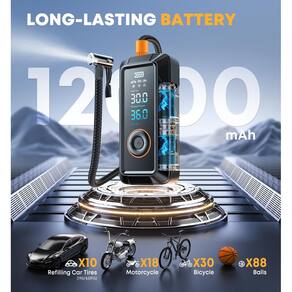 - 👍?-?A bomba de ar portátil possui uma bateria recarregável de 12.000 mAh integrada para potência de longa duração, permitindo que você encha os pneus do seu carro onde precisar. Chega de procurar tomadas elétricas ou lidar com cabos emaranhados! Com uma única carga, funciona por até 20 a 30 minutos – o suficiente para inflar 10 pneus de carro ou 30 pneus de bicicleta. Diga adeus à ansiedade da bateria