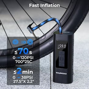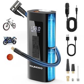 Compressor de ar portátil com inflador de pneus - 🚴?Inflador super rápido com extrema precisão?A bomba de ar de bateria de 6000 mAh inclui uma porta tipo C e um cabo de carregamento do carro. Leva apenas 70 segundos para encher os pneus de bicicleta de estrada 700* 25C. A bomba de bicicleta pode encher 6 pneus de carro ou 15 pneus de bicicleta de corrida, longe do problema de baixa potência. O inflador de pneus atinge uma pressão máxima de 150 PSI para atender aos requisitos de alta pressão para bicicletas de estrada e carros aerodinâmicos. Sendo mais rápido e altamente preciso, é a escolha ideal para um inflador de pneus! - 🚗?Portátil e versátil?Nosso compressor de ar de tamanho pequeno é fácil de transportar e colocar na estrutura ou na mochila. A mangueira de alta pressão pode ser facilmente inflada de todos os ângulos, incluindo todas as direções desafiadoras. Inflador de pneu portátil equipado com 5 bicos adequados para diferentes tipos de bicicletas, motocicletas, carros, bolas, ringues de natação, etc. - ???Operação automática com um clique?A bomba de ar automática oferece 4 modos de inflação predefinidos (carros, bicicletas, motocicletas e bolas) e 4 unidades predefinidas (BAR, PSI, KPA e Kg/cm²). Com apenas um clique, você pode alternar para qualquer modo que precisar. Ao atingir o valor de pressão predefinido, o compressor de ar portátil YOUNGDO para automaticamente, dando a você a liberdade de relaxar e evitar verificá-lo repetidamente. - 🏍??Tela LCD precisa?Esta bomba de ar para pneus de automóveis é equipada com telas LCD digitais, exibe a pressão dos pneus em tempo real e dados predefinidos da pressão dos pneus. Você pode controlar com precisão a pressão de enchimento por meio da tela, facilitando o monitoramento do status da pressão dos pneus. Além disso, você pode predefinir a pressão desejada do pneu, a bomba do pneu será desligada automaticamente quando atingir a pressão definida. Não precisa se preocupar com o excesso de enchimento dos pneus, tornando-os seguros de usar. - 🚚?Dispositivo 3 em 1?Inflador, banco de energia e lanterna. - Além de servir como um compressor de ar portátil, você pode usá-lo para carregar seu telefone celular, luz de bicicleta, bateria do mecanismo de comutação, etc. A luz LED superior (3 modos de luz) desta bomba de ar pode ser conveniente para você encher e trocar pneus no escuro ou avisar outros veículos à noite. - 🕛?Atendimento ao cliente?Este compressor de ar portátil vem com garantia de 2 anos. Se você encontrar algum problema durante o uso, pela Amazon a qualquer momento. Nós responderemos dentro de 24 horas.