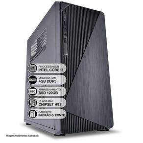 Computador Desktop, Intel Core I3 4º Geração, 4Gb Ram, Ssd 120Gb, Hdmi Marca: computador desktop intelModelo: gabinete preto atx intel core i3 Equipamento com suporte e desempenho dentro do esperado para você realizar todas as atividades do seu dia à dia, com fluidez e eficiência em suas tarefas. Possui design moderno e compacto. Execute suas atividades de forma precisa e eficaz, com bom desempenho e baixo consumo de energia. Computador versátil, indicado para o seu entretenimento tais como vídeos, músicas e trabalho ou estudo. Indicado tanto para uso doméstico como uso corporativo. Especificações: Gabinete:Cor: preto Fonte de alimentação bivolt Tipo: torre Placa-mãe:Chipset h81 Conexões usb Hdmi Vga Áudio Porta lan - rj 45 Conector sata 2x slots de memoria ram ddr3 Slot pci-express Processador:Intel core i3-4130 Memoria ram:4gb ddr3 Hd/ssd: Ssd 120gb Sistema operacional:Não acompanha sistema operacional instalado.Compatível com windows xp/7/10 e linux Obs: Imagem ilustrativa do produto, o modelo do gabinete a ser enviado dependerá da disponibilidade no momento da montagem do computador, sempre respeitando o padrão de cor preto e boa qualidade do produto. Não acompanha monitor, teclado, mouse ou caixas de som. Não acompanha gravador de dvd.