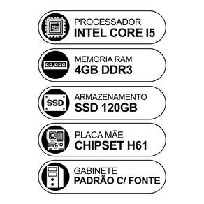 MARCA: COMPUTADOR DESKTOP INTELMODELO: GABINETE PRETO ATX | INTEL CORE I5Equipamento com suporte e desempenho dentro do esperado para você realizar todas as atividades do seu dia à dia, com fluidez e eficiência em suas tarefas. Possui design moderno e compacto. Execute suas atividades de forma precisa e eficaz, com bom desempenho e baixo consumo de energia. Computador versátil, indicado para o seu entretenimento tais como vídeos, músicas e trabalho ou estudo. Indicado tanto para uso doméstico como uso corporativo. ESPECIFICAÇÕES: GABINETE:Cor: PretoFonte de Alimentação BivoltTipo: TorrePLACA-MÃE:Chipset H61Conexões USBHDMIVGAÁudioPorta LAN - RJ 45Conector SATA2x Slots de Memoria Ram DDR3Slot PCI-ExpressPROCESSADOR:Intel Core I5 2 GeraçãoMEMORIA RAM:4GB DDR3HD/SSD: SSD 120GB SISTEMA OPERACIONAL:NÃO ACOMPANHA SISTEMA OPERACIONAL INSTALADO.COMPATÍVEL COM WINDOWS XP/7/10 E LINUXOBS: Imagem ilustrativa do produto, o modelo do Gabinete a ser enviado dependerá da disponibilidade no momento da montagem do computador.Sempre respeitando o padrão de cor preto e boa qualidade do produto.Não acompanha Monitor, Teclado, Mouse ou Caixas de Som.Não acompanha Gravador de DVD.