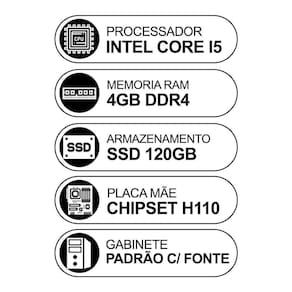 MARCA: COMPUTADOR DESKTOP INTELMODELO: GABINETE PRETO ATX | INTEL CORE I5Equipamento com suporte e desempenho dentro do esperado para você realizar todas as atividades do seu dia à dia, com fluidez e eficiência em suas tarefas. Possui design moderno e compacto. Execute suas atividades de forma precisa e eficaz, com bom desempenho e baixo consumo de energia. Computador versátil, indicado para o seu entretenimento tais como vídeos, músicas e trabalho ou estudo. Indicado tanto para uso doméstico como uso corporativo. ESPECIFICAÇÕES: GABINETE:Cor: PretoFonte de Alimentação BivoltTipo: TorrePLACA-MÃE:Chipset H110Conexões USBHDMIVGAÁudioPorta LAN - RJ 45Conector SATA2x Slots de Memoria Ram DDR4Slot PCI-ExpressPROCESSADOR:Intel Core I5 6 GeraçãoMEMORIA RAM:4GB DDR4HD/SSD: SSD 120GB SISTEMA OPERACIONAL:NÃO ACOMPANHA SISTEMA OPERACIONAL INSTALADO.COMPATÍVEL COM WINDOWS XP/7/10 E LINUXOBS: Imagem ilustrativa do produto, o modelo do Gabinete a ser enviado dependerá da disponibilidade no momento da montagem do computador, sempre respeitando o padrão de cor preto e boa qualidade do produto.Não acompanha Monitor, Teclado, Mouse ou Caixas de Som.Não acompanha Gravador de DVD.