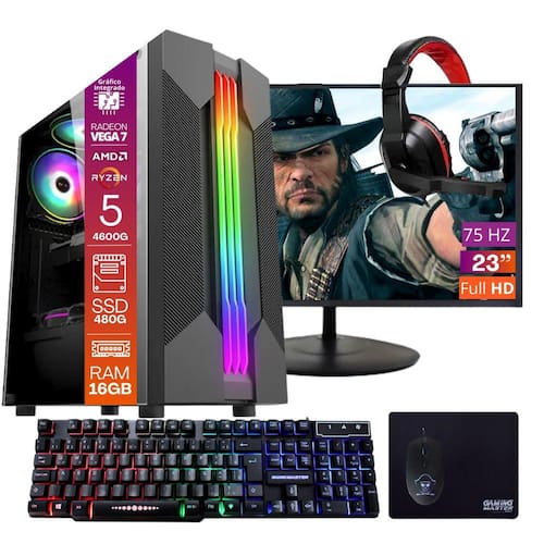 Com o Computador Gamer Ryzen 5 4600G 16GB de Memória SSD 480GB Teclado Mouse Mousepad Headset Gamer gabinete gamer RGB com Windows, monitor de 23" e diversos jogos instalados, você terá alto desempenho e designer Gamer moderno.