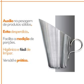 A Concha Medidora tem altura de 8,5cm e capacidade para 100 ML. Ela é feita de alumínio resistente, garantindo durabilidade e qualidade.