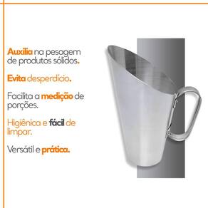 A Concha Medidora tem altura de 22cm e capacidade para 500 gramas. Ela é feita de alumínio resistente, garantindo durabilidade e qualidade.