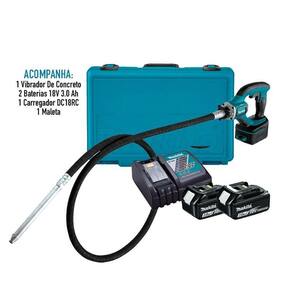 de concreto a bateria 18v com 2 baterias 3ah carregador bivolt e maleta makita dvr850rfe Completo com mangote de 2,4 metros Realiza até 27 minutos de tempo de execução sob carga com bl1830b acompanha 2 unidades bl180b . E realiza até 41 minutos de tempo de execução sob carga com bl1850b. Chave dupla para controle máximo nas posições horizontal e vertical. A tampa protetora no e na bateria minimiza a contaminação. Comprimento do eixo de 2,4 m 8 com diâmetro do de 25 mm 1 . O mais longo desta classe. O eixo flexível de 2,4 m 8 é bastante eficaz com nivelamento e remoção de bolhas de ar em fundações profundas. Características Mangote de 2.400mm 2,4mts Especificações Diâmetro da garrafa : 25mm Comprimento do magote : 2.400mm Vibrações por minuto : 12.500 Dimensões c x l x a : 2.683 x 93 x 250mm Peso : 5,2kg Bateria : 18v Itens que acompanham 2 baterias 18v 3.0 ah bl1830b, carregador rápido dc18rc bivolt e maleta. Imagens meramente ilustrativas Marca: Não Informado