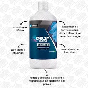 O DeltaClean é um produto formulado para uso em aquários e projetado para neutralizar de forma eficaz o cloro e cloraminas presentes na água. Apesar de serem comuns no sistema de tratamento de água potável, o cloro e as cloraminas podem ser prejudiciais para os peixes e outros organismos aquáticos. O DeltaClean é essencial para garantir que a água seja segura para todos os seres vivos do aquário. O DeltaClean também auxilia na remoção de metais pesados que podem estar presentes em concentrações mínimas na água de abastecimento. O DeltaClean contém extrato de Aloe Vera, que reduz o e acelera a regeneração da epiderme dos peixes, diminuindo riscos de inflamações. E prebiótico, para equilibrar a microbiota do aquário, estimular a microbiota intestinal dos animais e melhorar na conversão do alimento. EMBALAGEM: 500ml Marca: Delta Fish