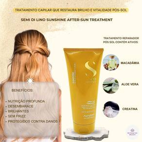 Para um cuidado completo dos cabelos expostos ao sol, mar e piscina, combine a máscara de tratamento para cabelos danificados pelo sol com o shampoo alfaparf semi di lino after-sun e o finalizador bifásico protetor semi di lino sunshine para uma rotina de cuidados intensiva e eficaz.