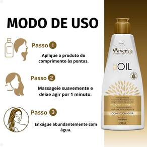 Após o uso do shampoo, aplique o Condicionador Tec Oil do comprimento às pontas, massageando suavemente. Deixe agir por 1 minuto, em seguida enxágue com água em abundância. O uso completo da linha Tec Oil favorece os resultados.