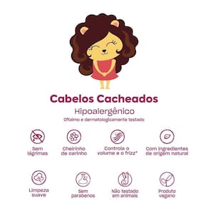Características Adicionais: Desenvolvido para cabelos cacheados de bebês e crianças Auxilia no controle de volume e redução do frizz Hipoalergênico, com ingredientes de origem natural Fórmula vegana, sem parabenos e não testada em animais Livre de lágrimas e dermatologicamente e oftalmologicamente testado Deixa os cabelos macios, com brilho natural e cheirinho suave Indicado para uso frequente, promove ondulado natural com cuidado delicado