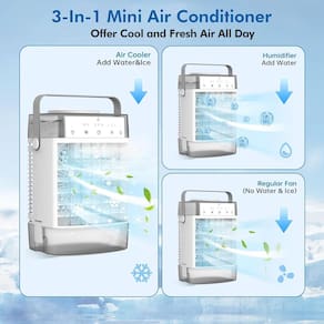 - ?Ventilador de ar condicionado portátil 3 em 1? Este compacto essencial de resfriamento de verão combina um refrigerador de ar, umidificador e ventilador em um dispositivo compacto. Medindo 21,6 cm (C) x 18 cm (L) x 31,2 cm (A) e pesando apenas 1,2 kg (libras), ele usa tecnologia de resfriamento evaporativo para proporcionar uma brisa gelada. Sem necessidade de instalação, este ventilador CA portátil multifuncional é ideal para resfriar quartos, escritórios ou espaços ao ar livre, como pátios e tendas.