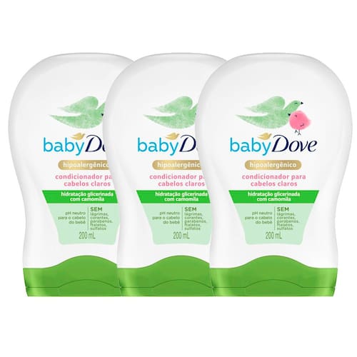 CONDICIONADORDOVE BABY HIDRATAÇÃO ENRIQUECIDA CABELOS CLAROS Com Camomila. Ele vai além da suavidade, pois ajuda a repor a hidratação do couro cabeludo, enquanto condiciona suavemente os cachinhos do seu bebê. Deixa o cabelo claro macio, delicadamente perfumado e fácil de pentear. Modo de usar: Após lavar o cabelo com shampoo, aplique uma pequena quantidade do produto nas mãos, massageie o cabelo úmido. Enxágue. Marca: Não Informado