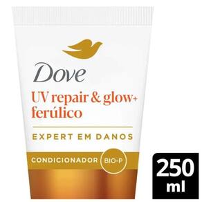 Condicionador Dove UV Repair & Glow + Ferúlico 250 ml Familia CONDICIONADOR Condicionador Dove UV Repair & Glow + Ferúlico 250 mlbr / Br / Este condicionador foi desenvolvido para restaurar fios danificados pela açãobr / Do sol, devolvendo brilho e saúde capilar. Sua fórmula conta com Bio-Protein ebr / Sérum Ferúlico, que promovem reparação de até 99 % dos danos acumulados porbr / Raios UV. Além disso, sela as cutículas capilares e prolonga o brilho por atébr / 120 horas. Ideal para cabelos expostos ao sol, clareados ou quimicamentebr / Tratados, ele oferece um sensorial leve e perfume sofisticado com notasbr / Br / Benefícios e diferenciaisbr / Br / Br / Restauraçãobr / De danos causados por raios UVbr / Efeitobr / De brilho intenso por até 120 horasbr / Selabr / Cutículas para proteger contra agressões externasbr / Fórmulabr / Leve com sensorial agradávelbr / Compatívelbr / Com diversos tipos de cabelo, inclusive os mais fragilizadosbr / Br / Br / Modo de usobr / Br / Br / Apósbr / Apliquebr / Deixebr / Marca: Não Informado Ean: 7891150102750
