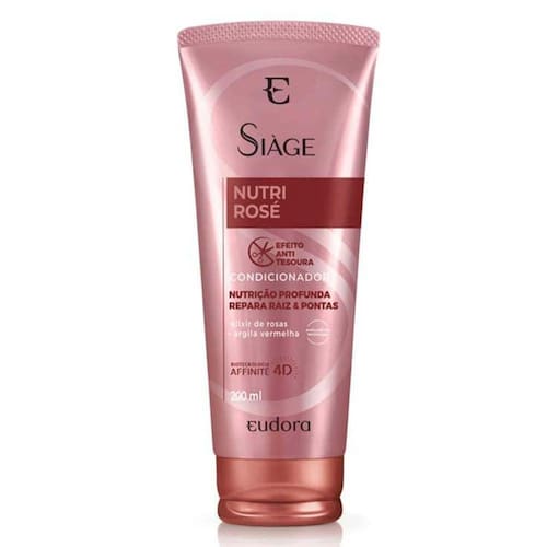 O Condicionador Eudora Siàge Nutri Rosé 200ml contém uma ação purificante e limpa profundamente da raiz as pontas sem ressecar os fios, além de ser enriquecido pelo poderoso Elixir de Rosas que é um ativo poderoso obtido através da colheita de 30 mil pétalas de rosas que garante a reparação dos fios por inteiro. Em sua fórmula possui a biotecnologia Affinité 4D é uma evolução da antiga tecnologia Affinité 3D. Incluímos uma proteína inteligente na matriz que detecta as áreas danificadas do fio e agora, além de garantir tratamento prolongado mesmo após o enxágue, também trata de forma mais eficaz as áreas danificadas do cabelo.