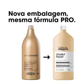 O Condicionador L'Oréal Professionnel Serie Expert Absolut Repair Gold Quinoa, de 1500 ml, desembaraça, repara e reconstrói os fios de forma imediata. Garante 77% menos danos, além de proporcionar 7x mais brilho e maciez aos cabelos. Indicado para cabelos finos, danificados e quebradiços, este condicionador conta com ingredientes essenciais, como a Quinoa Dourada e a Proteína Hidrolisada de Trigo que formam um filme protetor, mantém as cutículas seladas e retém as propriedades restauradoras dentro da fibra capilar. Com tecnologia de co-emulsão potencializa os benefícios, oferecendo força e saúde aos fios. É recomendado para , em tamanho de salão que rende muito mais. Benefícios: Desembaraça; Reconstrução; 77% menos danos; 7x mais brilho; Toque leve e macio; Rende Mais. Modo de usar: Use o condicionador em uma quantidade do tamanho de uma moeda de 50 centavos no cabelo limpo e molhado, pelo comprimento e pontas. Deixe agir de 2 a 3 minutos, em seguida, enxágue bem. Em caso de contato com os olhos, lavá-los imediatamente com água abundante.