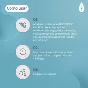 Após usar o shampoo JOHNSONS Blackinho Poderoso, aplique o condicionador nos cabelos molhados, mecha a mecha do comprimento até às pontas, desembaraçando os fios das pontas à raiz. Para uso como condicionador deixe agir por 1 minuto ou para máscara 4 minutos. Em seguida, enxague bem.