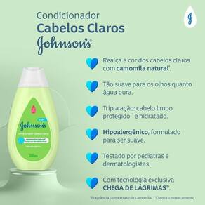 Benefícios e diferenciais: Realça a cor dos cabelos claros com camomila natural** Tão suave para os olhos quanto água pura Tripla ação: cabelo limpo, protegido* e hidratado (*contra o ressecamento) Hipoalergênico, formulado para ser suave Testado por pediatras e dermatologistas PH ideal para a delicada pele do bebê Feito com glicerina de origem natural