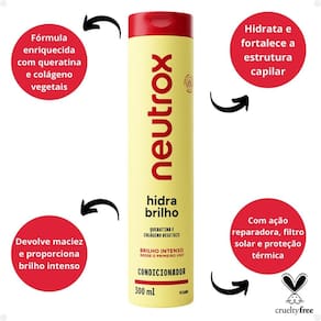 O Condicionador Hidra Brilho sela as cutículas dos fios hidratando profundamente os cabelos, devolvendo seu brilho desde o primeiro uso. Com queratina e colágeno vegetais, em conjunto com os demais ingredientes, sua fórmula hidrata e fortalece os fios, restaurando a suavidade e proporcionando um cabelo hidratado e macio. A linha hidra brilho é ideal para cabelos opacos e desidratados. Vegano. Não testado em animais. Combinação exclusiva com ação reparadora, filtro solar e proteção térmica que blinda os fios.