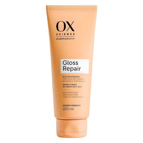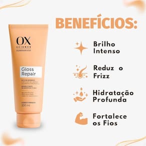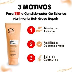 Condicionador Ox Science Mari Maria Hair Gloss Repair 200ml O Condicionador Ox Science Mari Maria Hair Gloss Repair 200ml combina tecnologia avançada e performance profissional para proporcionar brilho intenso, maciez e força aos fios. Sua fórmula reparadora atua na reconstrução da fibra capilar, promovendo selagem das cutículas e efeito gloss imediato. Ideal para cabelos danificados ou opacos, devolve a vitalidade e o movimento natural, deixando os fios mais leves, hidratados e com um brilho espelhado irresistível.