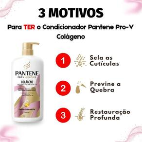 Modo de Uso/Aplicação Após lavar os cabelos com shampoo, aplique o Condicionador Pantene Pro-V Colágeno Hidrata e Resgata aos cabelos molhados, distribuindo uniformemente do meio às pontas. Deixe agir por alguns minutos para que os ingredientes ativos penetrem nos fios e, em seguida, enxágue abundantemente.