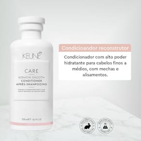 Keratin Smooth repara os fios, atuando na reposição dos nutrientes e introduzindo Queratina na fibra capilar enfraquecida. A perda de queratina devido a procedimentos químicos deixa os cabelos vulneráveis à quebra. A Linha Care Keratin Smooth, de Keune fortalece profundamente os fios, conferindo um verdadeiro choque de Queratina que elimina o frizz e torna os cabelos mais fortes, sedosos e saudáveis e alinhados.