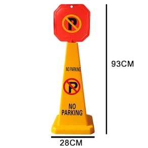 Este cone de trânsito amarelo vibrante apresenta um aviso de "Proibido Estacionar" e um símbolo claro de proibido estacionar para máxima visibilidade.