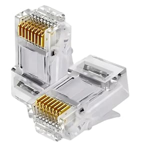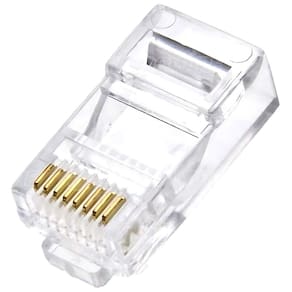 O conector é fabricado em policarbonato transparente de alta resistência, o que assegura durabilidade, ótima condução elétrica e resistência mecânica. Seus 8 contatos (pinos) metálicos banhados a ouro garantem excelente condutividade, minimizando interferências e perdas de sinal, mesmo em redes de alta velocidade, como Gigabit Ethernet.