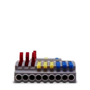 Os conectores de emenda e derivação kv4xxx são dispositivos de fácil aplicação e instalação. Permite que você faça emendas e derivações de fios de forma rápida, prática e segura. Podem ser utilizados em conexões da fiação de veículos, locais sujeitos a vibração ou em conexões internas de fiação de eletrodomésticos, Máquinas ou qualquer categoria de aparelhos elétricos com alimentação de até 600v. Em caso de necessidade os conectores podem ser reutilizados. Informações técnicas do produto Corrente máxima 32a Tensão máxima de operação 600v Temperatura máxima de operação Até 70c Temperatura em regime de emergência 100ºc Tensão máxima de surto 4kv Cabos 0,08 - 4mm Material do corpo Nylon pa 6.6 Antichama Sim Mola de fixação dos cabos Aço inoxidável Aço inoxidável Latão com acabamento estanhado Tipo de conector Ca fêmea Fixação do cabo Por alavanca Quantidade de conexões de entrada 2 Quantidade de conexões de saída 6 Grau de proteção Ip20
