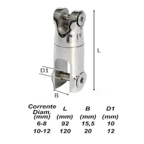 Conector Destorcedor Âncora E Correntes De 6 a 8mm Em aço inox, com pino destorcedor reforçado, abertura para corrente de 6 a 8mm.Utilizado para junção da corrente galvanizada ou inox em âncora de todos os modelos.Modelo universal, utilizado para tirar a tensão dos cabos e correntes Informações adicionais: Fabricante: marine town Material: aço inox 316 Giro 360 graus Resistente a impactos Corrente utilizada 6mm e 8mm Itens inclusos na embalagem:01 Conector De Âncora 6 a 8mm