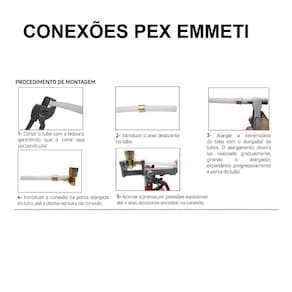 1) Cortar o tubo com a tesoura, garantindo que o corte seja perpendicular. 2) Introduzir anel deslizante 3) Alargar a extremidade do tubo com o alargador de tubos (não fornecido, procure em nossos anúncios). O alargamento deverá ser realizado gradualmente girando o alargador, expandindo progressivamente a ponta do tubo. 4) Introduzir a conexão na ponta alargada do tubo até a última nervura da conexão 5) Acionar a prensa por pressões sucessivas até o anel deslizante encostar na conexão
