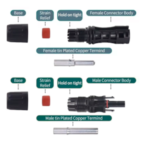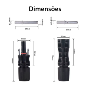 Este conector MC4 é compatível com as conexões padrão de sistemas de energia solar existentes. Seus diferenciais são os pinos sólidos de contato que possuem capacidade superior de 40A e 1500V.