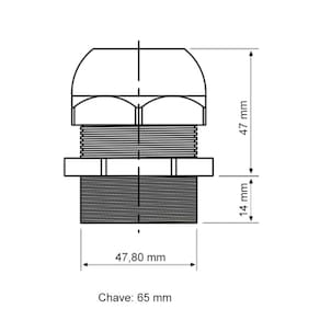 Produzido em termoplástico com rosca padrão BSP tipo gás. Pode ser utilizado para vedação das entradas de cabos elétricos em caixas ou em outros aparelhos. Possui uma bucha cônica de aperto e vedação para a acomodação do cabo elétrico. Orientações Diâmetro da bucha: 32 mm a 38 mm. Observações A instalação e segurança: É importante que o produto seja instalado por profissional habilitado. Antes de instalar, desligue a energia elétrica. Características Gerais EAN13 7891435028331 DUN14 17891435028338 NCM 3917.40.90 Peso Líquido 0,1100 kg. Peso Bruto 0,1164 kg. Metragem 0,000261 m³. Dimensões Embalagem (Compr. X Larg. X Alt.) 62x 62x 68 mm. Dimensões Produto (Compr. X Larg. X Alt.) 62x 62x 68 mm.