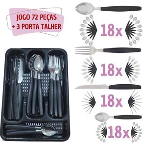 Conj de talheres + porta talher O Conjunto de talheres com porta talher é um conjunto de utensílios de mesa composto por talheres básicos, como garfos, facas, colheres e colheres de chá, acompanhados de um prático porta talheres para armazenamento e transporte conveniente. Esse conjunto é ideal para uso em casa, em viagens, acampamentos, piqueniques e outras ocasiões em que seja necessário levar os talheres consigo. Os talheres são compostos por aço inoxidável de alta qualidade e um porta talher feito de plástico durável. Os talheres são fabricados em aço inoxidável, um material conhecido por sua resistência à corrosão e durabilidade. Eles são projetados para serem resistentes e duráveis, permitindo o uso contínuo sem enferrujar ou corroer, mesmo com o contato frequente com alimentos e água.
