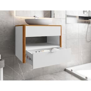 O Conjunto Para Banheiro Santorini é ideal para sua casa! Com design inovador possui seus cantos em molduras com design curvo. Ele é composto por cuba de mármore sintético no formal oval. Gabinete com amplo nicho e gaveta com puxador em alumínio anodizado e corrediças telescópicas proporcionando a abertura completa da gaveta bem como um deslizar mais suave.