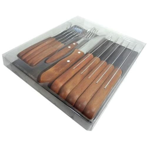 Especificações Técnicas: - Material: Aço Inox e Madeira - 06 Facas: 25cm x 2,5cm x 1,5cm - 06 Garfos: 19,5cm x 2,4cm x 1cm - Peso: 570g