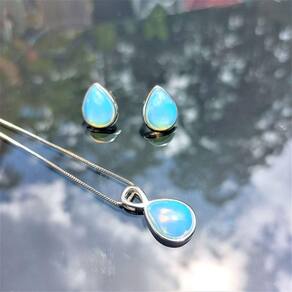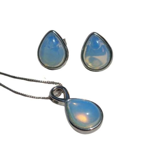 01 Par de Brincos Ródio Branco com Pedra Oplanila 01 Colar Ródio, tamanho 40cm e extensor de 5cm com Pingente Ródio Branco com Pedra Opalina.